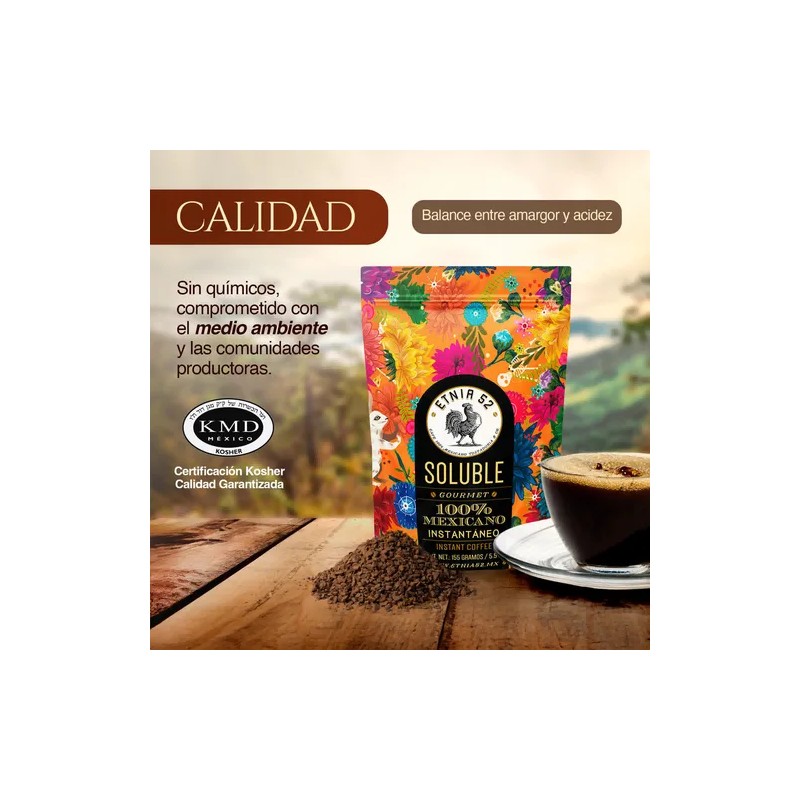 ETNIA 52 Café Soluble Clásico Instantaneo y Aglomerado | 155g | Aroma y Gusto Firme | Balance en Amargor y Acidez | Sin azúcares añadidos | 100% Mexicano | Certificación Kosher | Café Soluble