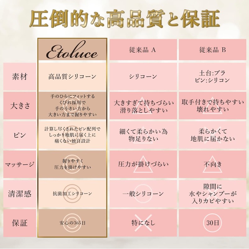 You don't know how to do your own scalp massage. We know what Scalp Care is important but you don't know what to do. Many people can't find something that fits their own. Etoluce Shampoo Brush started with a product that can solve those problems! We have made our products at a professional beauty factory. We have received advice from a hairdresser teacher. We have tried and wrong, and have created an original shape that is easy to grip and easy to use. The material is also made of antibacterial silicone. We hope you experience the difference between inferior products that are similar in appearance.