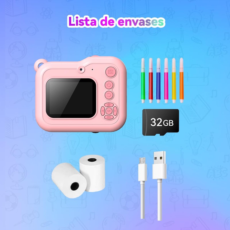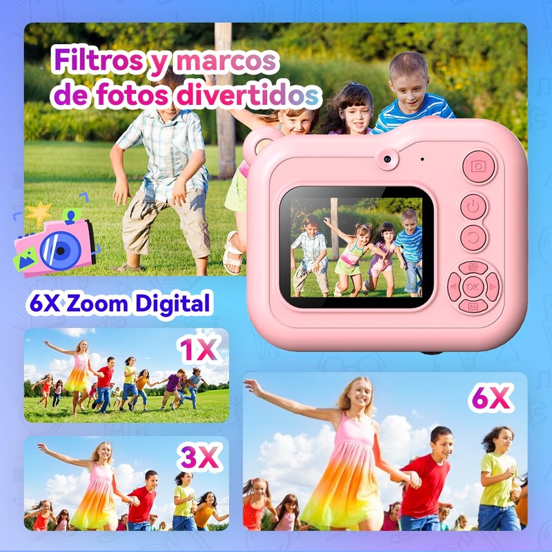 - IMPRESIÓN INSTANTÁNEA y CAPTURA DIGITAL – Imprime fotos en blanco y negro al instante mientras guarda imágenes a color en la tarjeta TF de 32GB. Con marcos divertidos, stickers y filtros, los niños pueden dar rienda suelta a su creatividad y personalizar cada foto