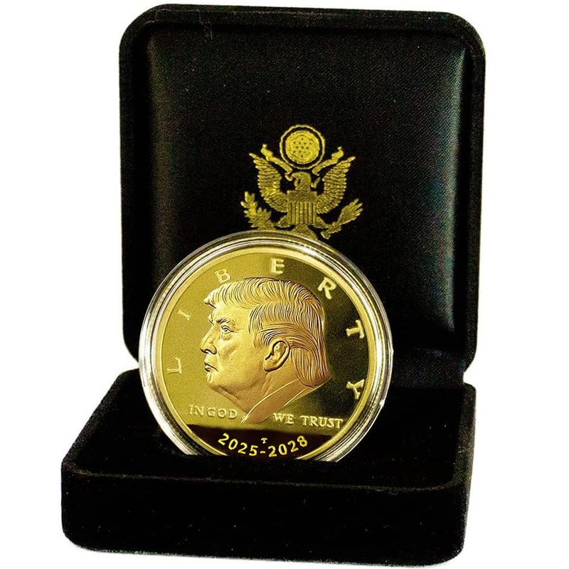 eTradewinds Donald J.Trump Replica Gold Piece, 2025-2028 Edición Presidencial de 24 quilates Moneda chapada en oro de 24 quilates, vitrina de terciopelo, certificado de autenticidad con soporte de
