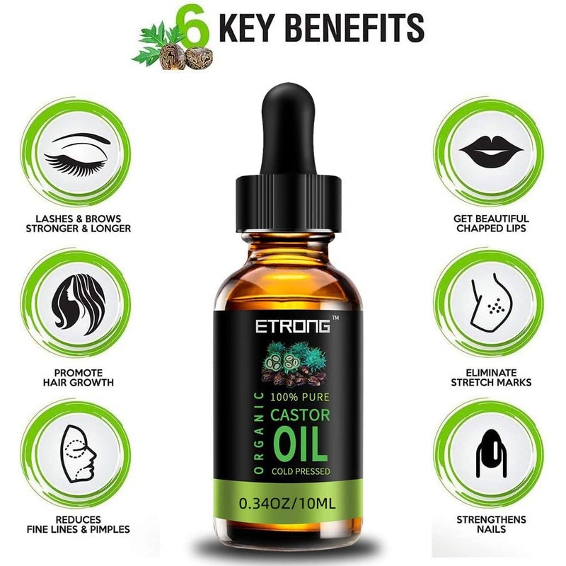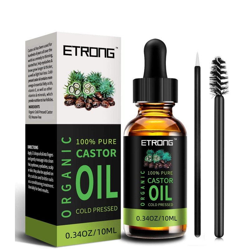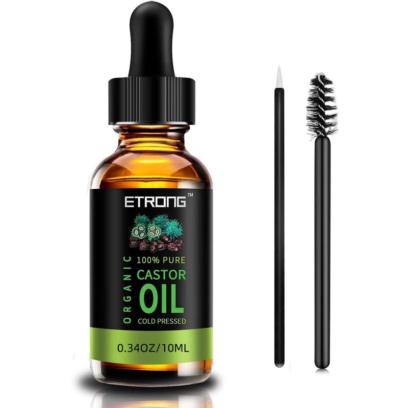 ETRONG Organic Castor Oil,Pure Cold Pressed Castor Oil for Eyebrows,Eyelashes,Hair Growth,Nails,and Skin with 1 Set of Eyebrow&Eyeliner Brushes (10 ml)