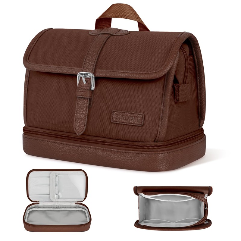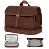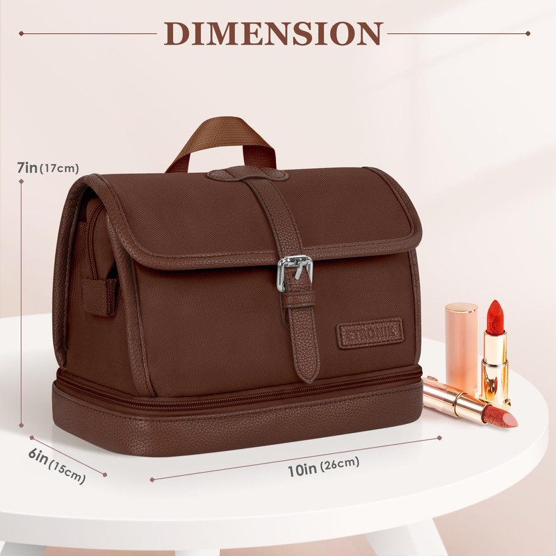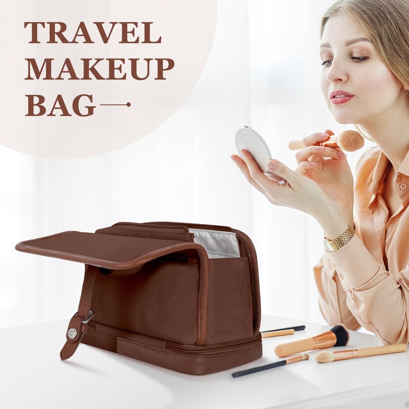 ETRONIK Flap Makeup Bag, Double Layer Travel Makeup Bag, Large Leather Cosmetic Travel Bag, Portable Makeup Bag Organizer for Women and Girls, Coffee