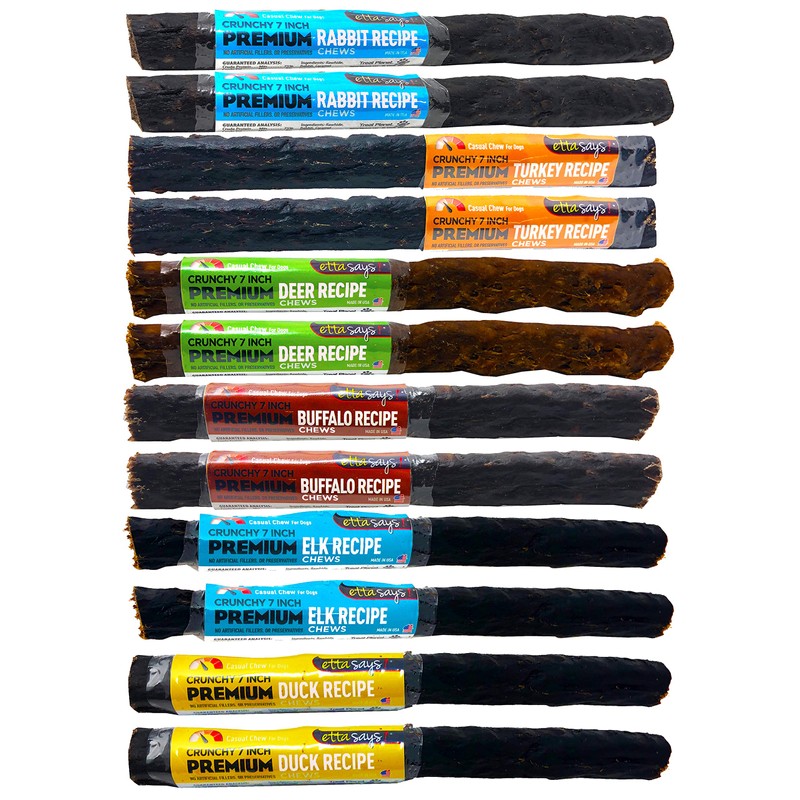 - VARIETY PACK OF 12 – Premium Crunchy Chews Variety Pack of 12 – Featured protein is Duck, Rabbit, Deer, Elk, Buffalo and Turkey. Each chew is 7”. Receive 2 of each protein.