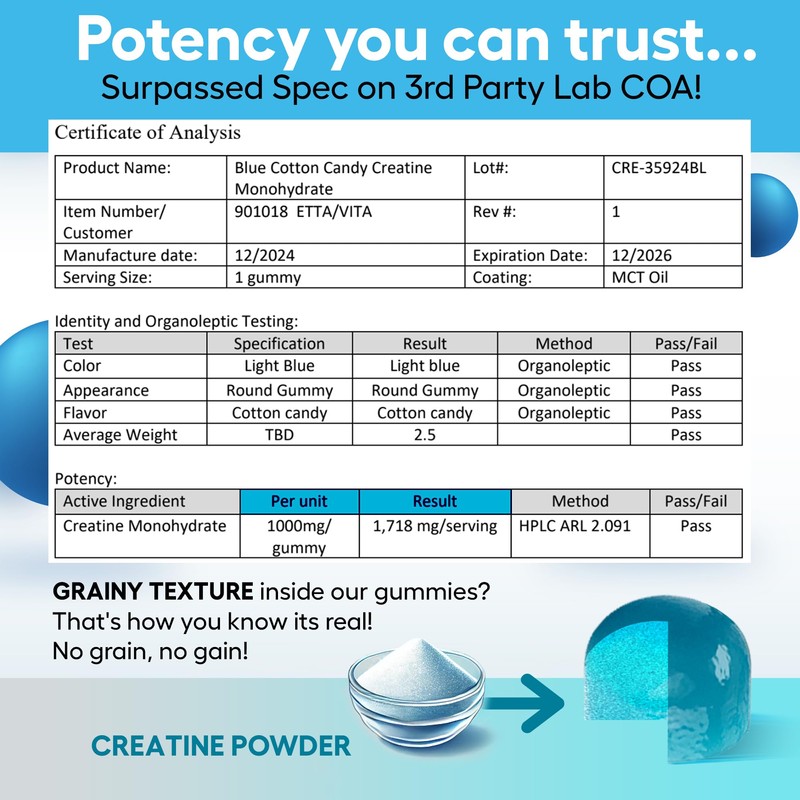 - [High-Quality Lab-Tested Ingredients] Our mono-hydrate gummies are manufactured, tested, and bottled in our GMP-certified facilities. Etta Vita is committed to the highest quality ingredients and manufacturing processes.