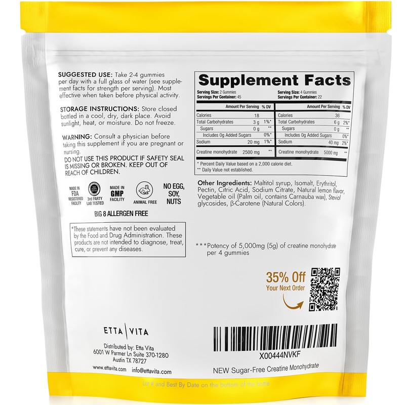 Etta Vita Sugar-Free Creatine Monohydrate Gummies 5gram per Serving, Potent C...