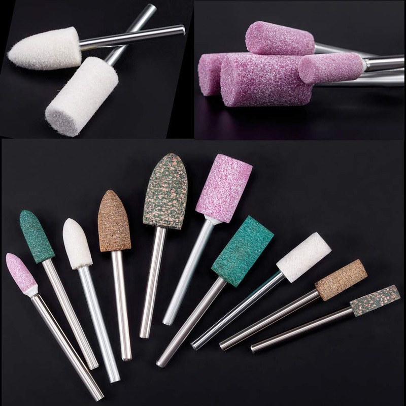 - 【Purpose of Each Grinding Head】-- 1.Pink Abrasive Stone Heads: for sanding chamfering 2.Sesame Grinding Bits: for rough grinding of metal such as aluminum copper 3.Cowhide Grinder Heads: with good elasticity & wear resistance, perfect for fine polishing of agate,jade,mold,copper and aluminum 4.Green Rubber bits: used for quick fine polishing of hardware accessories, jade etc. 5.Wool Bits: for mirror polishing with pneumatic, electric rotary grinder, various molds etc.