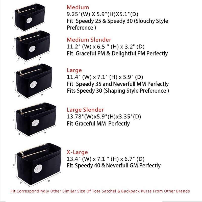 - [Measurement of the Purse Organizer]: Medium: 9.25(W)*5.9(H)*5.1(D)inch Fits Speedy 25 & 30 (Slouchy Style Preference). Medium Slender: 11.2(W)*6.5(H)*3.2(D)inch Fits Graceful PM and Delightful PM. Large: 11.4(W)*7.1(H) *5.9(D)inch Fit Speedy 35 and Neverfull MM Perfectly and Fits Speedy 30 (Shaping Style Preference). Slender Large: 13.78(W)*5.9(H)*3.35(D)Fit Graceful MM Perfectly. X-Large:13.4(W)*7.1(H)*6.7(D)inch fits Speedy 40 and Neverfull GM Perfectly.
