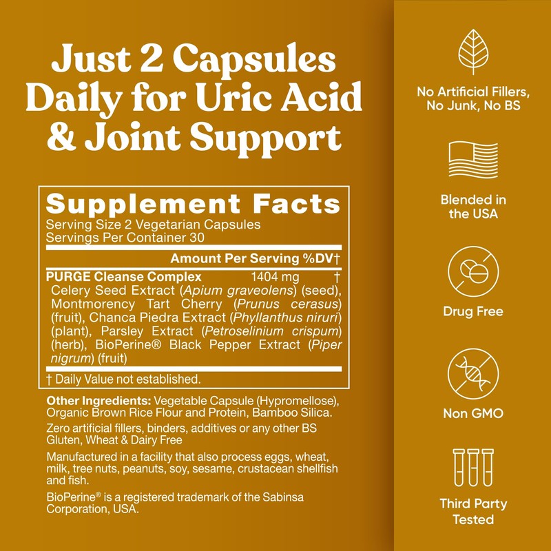 - 3-in-1 DAILY URIC ACID CLEANSE: Uric acid buildup can cause discomfort and impact flexibility and mobility – Purge! contains a powerful blend of antioxidant and anthocyanin-rich uric acid reducer ingredients to promote healthy uric acid levels and joint support