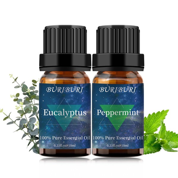 - Packing Includes: 10ml Eucalyptus Oil x1, 10ml Peppermint Oil x1. With no adulterants or dilution, 100% pure quality. BURIBURI scented oil is bottled in a durable amber glass bottle.