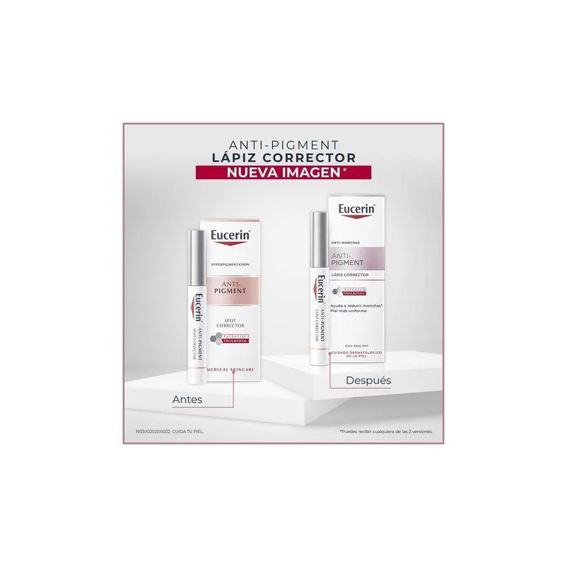 Eucerin ANTI-PIGMENT Spot Corrector es un aplicador no graso, especialmente diseñado para zonas localizadas con hiperpigmentación. Contiene Thiamidol, un ingrediente eficaz y patentado (En la Unión Europea y México) que actúa en la causa principal de la hiperpigmentación al reducir la producción de melanina.