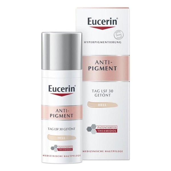 - Eucerin Anti-pigment day cream SPF 30 Colorata Light contains thiamidol, an effective and patented ingredient eucerin that acts at the root of hyperpigmentation and reduces the production of melanin. It has been clinically and dermatologically proven to reduce the intensity and expansion of spots and prevent the reappearance of stains. The first results are visible after two weeks and will continuously improve with regular use.