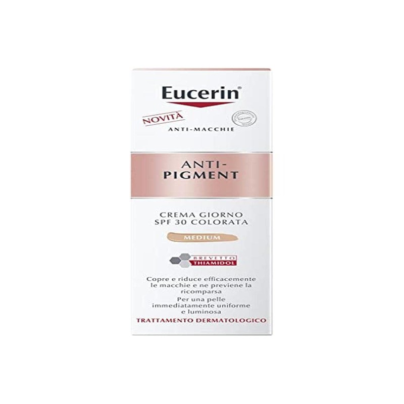 - Eucerin Anti-pigment day cream SPF 30 coloured. Sunlight, hormonal changes and ageing can lead to hyperpigmentation. The formation of spots makes the skin look less even. The thiamidol patent contained in the formula acts at the origin of hyperpigmentation spots and reduces the production of melanin; used regularly, prevents the reappearance of stains. With SPF 30+ UVA, it effectively prevents the formation of future sun spots.