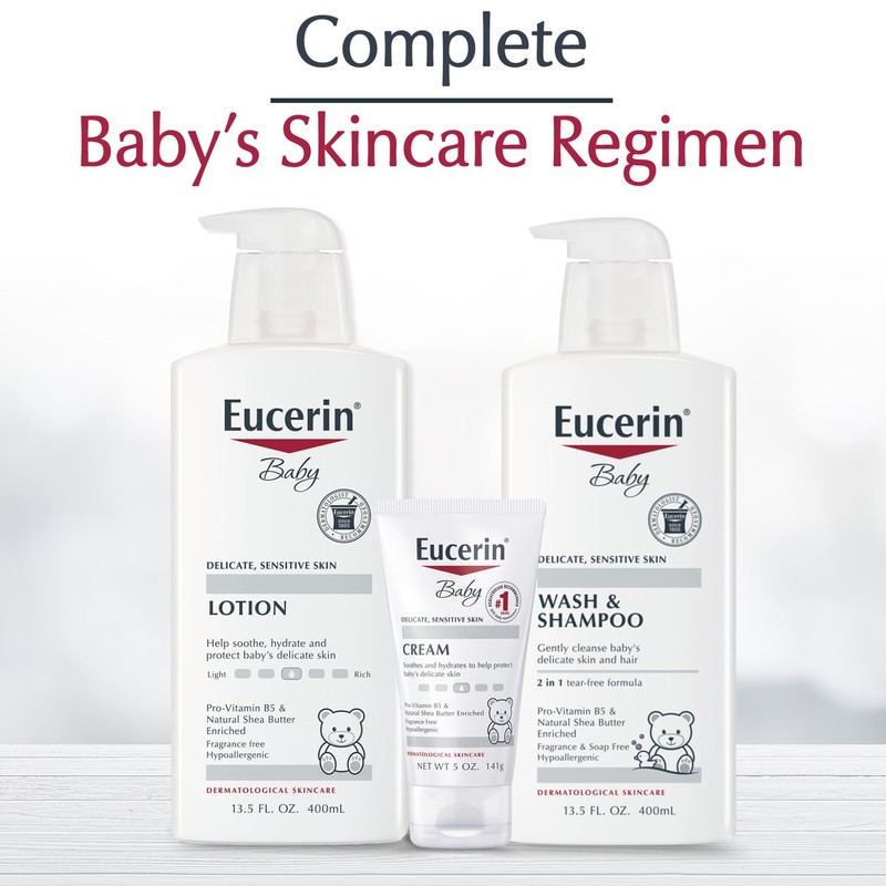 Eucerin Baby Lotion moisturizes and nourishes baby's delicate skin, helping to leave it soft, smooth and protected. This hypoallergenic baby moisturizer formula is gentle enough to use every day and is enriched with soothing ingredients like Pro-Vitamin B5 and natural Shea Butter. Eucerin unscented baby lotion sensitive skin formula is free of fragrances, parabens, dyes and drying alcohols. To use, massage Eucerin Baby moisturizing lotion daily on your baby's skin. For best results, use after your baby's bath. Eucerin Baby skin care products feature gentle formulas for baby skin care needs. Pair this baby lotion for dry skin with Eucerin Baby Wash and Shampoo as part of your baby essentials. Eucerin is a dermatologist and pediatrician recommended skin care brand that is based on an uncompromising approach to science.