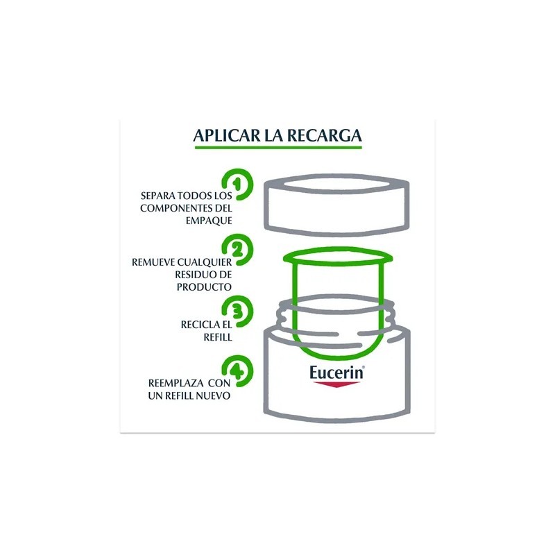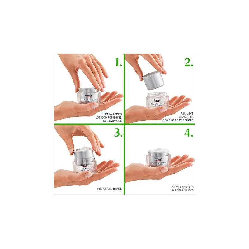 Eucerin Hyaluron-Filler +3x Effect Refill Crema de Noche reduce el uso de plástico en un 90% en comparación con el envase estándar.