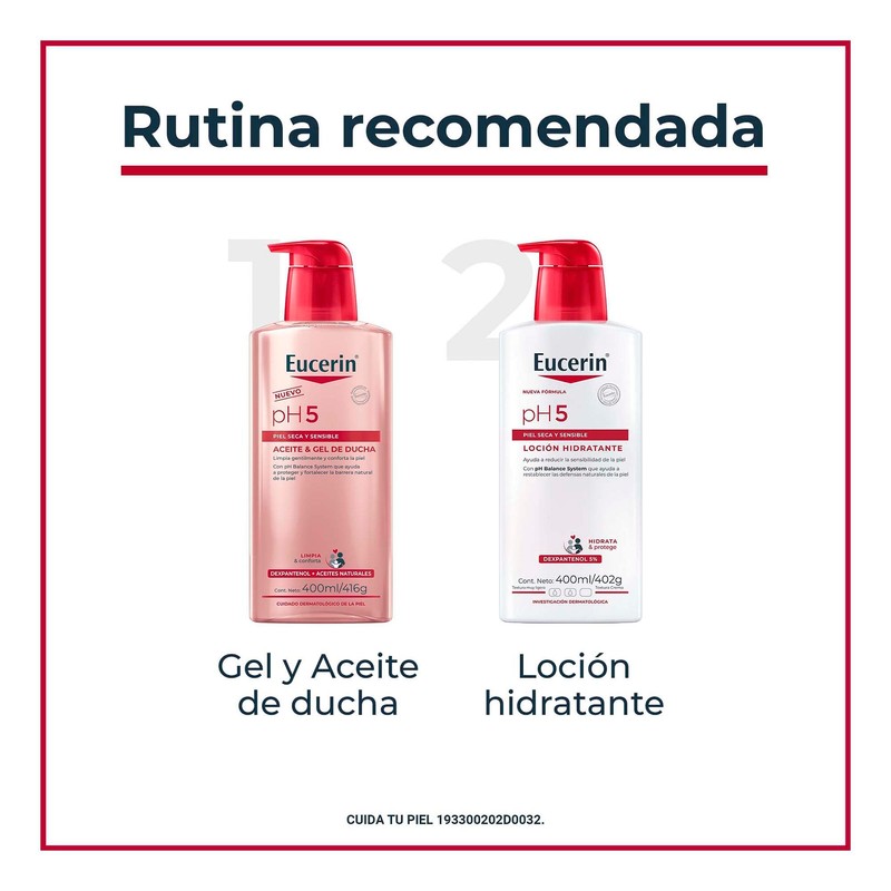 • LIMPIEZA GENTIL Y EFECTIVA: Eucerin pH5 Aceite & Gel de ducha está formulado para limpiar la piel sensible de manera suave pero efectiva, eliminando impurezas sin alterar su equilibrio natural. Su textura ligera y fórmula suave permiten una limpieza sin agresiones, ideal para pieles delicadas. FÓRMULA REPARADORA CON DEXPANTHENOL: La presencia de Dexpanthenol en su fórmula ayuda a reparar y regenerar la piel, promoviendo una barrera cutánea más fuerte. Este ingrediente es conocido por sus propiedades calmantes y reparadoras, ideales para pieles que necesitan un cuidado especial.