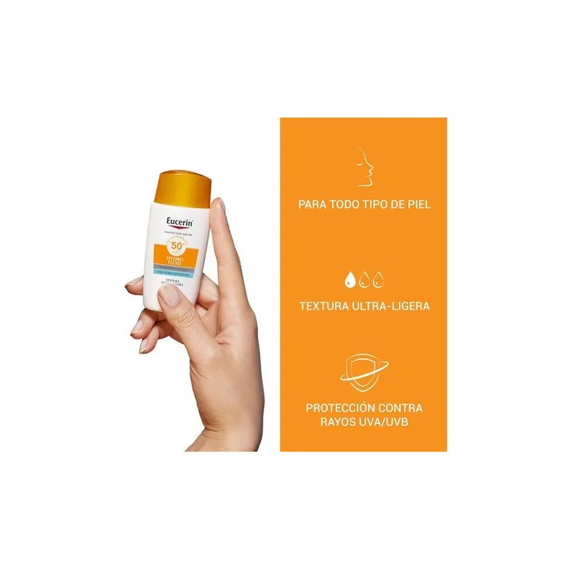 Propiedades: Textura ultraligera, 0% residuos, 0% grasoso, 0% pegajoso. Con fragancia, y con una fórmula ultraligera, no deja sensación grasa y de rápida absorción sin deja residuos después de su uso, Eucerin Sun Face Hydro-Fluid FPS 50+ ha demostrado clínica y dermatológicamente que es muy bien tolerado por todos los tipos de piel, incluida la piel sensible.