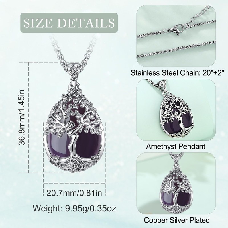 - Material: this amethyst tree of life pendant is made of copper and has a rhodium plated finish that increases the shine of the pendant surface. The chain is made of stainless steel, which is very suitable for daily wear.