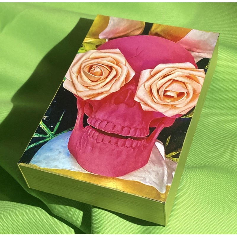 the platform of gold (death) & white(life) skulls. The pink center skull, symbolizing love & life.