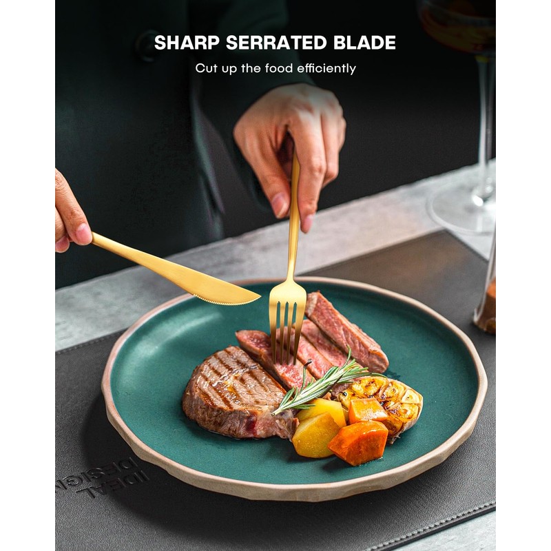 • Premium Matte Gold Silverware Set - 40 pieces flatware set specially designed for 8 people(Includes 8 dinner forks, 8 salad forks, 8 dinner spoons, 8 teaspoons and 8 dinner knives). The matte surface makes the cutlery set more elegant, suitable for kitchens, restaurants, cafes and hotels. And it can also help your dinner full of high-end feeling while having a party.