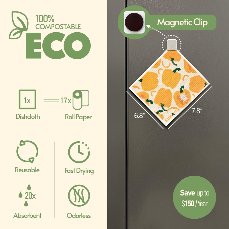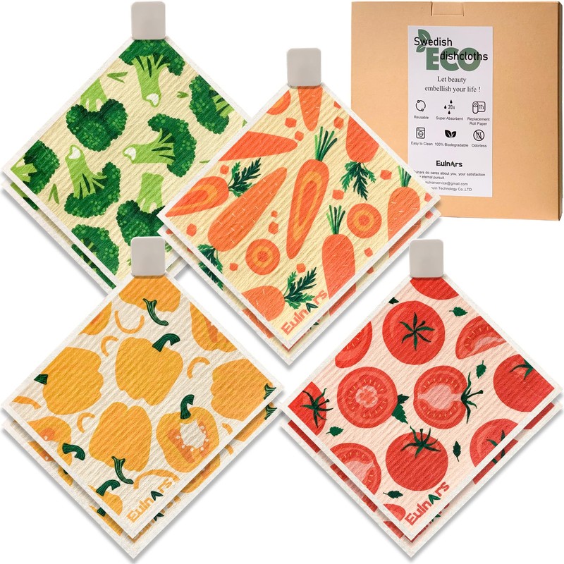 Eulnars 8 Pack Swedish Dish Cloth, Swedish Dish Towels with Clips, Non-Scratch Reusable Paper Towels, Super Absorbent Cellulose Sponge Cloths, Biodegradable, Dishwasher Safe