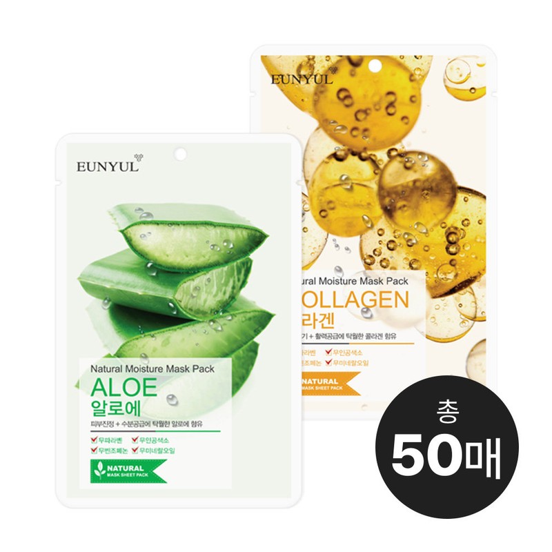 Eunyul Natural Mask Pack 50 sheets (25 aloe sheets + collagen 25 sheets)/Moisture, elasticity, whitening / 은율 내츄럴 마스크팩 50매 (알로에 25매+콜라겐25매)/수분 탄력 미백