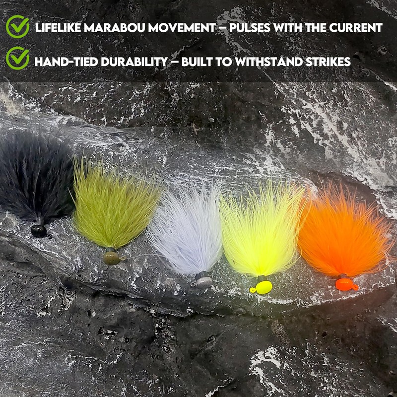 Lifelike Feather Movement: High-quality marabou feathers pulse and move even at rest, mimicking real aquatic prey to trigger strikes from sluggish fish.