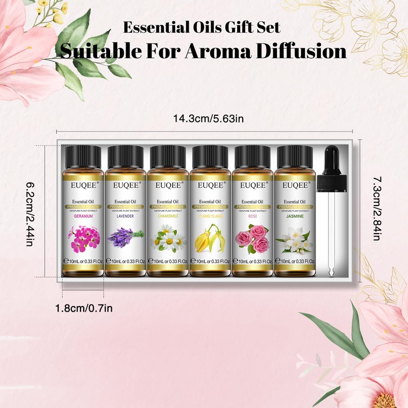 EUQEE Floral Essential Oils Set of 6 Pure Essential Oil Gift Set for Diffusers, Soap Making - Lavender, Rose, Chamomile, Ylang Ylang, Jasmine, Geranium Essential Oils - 10ml