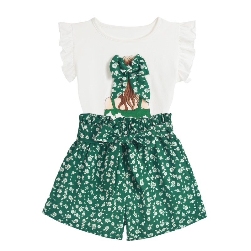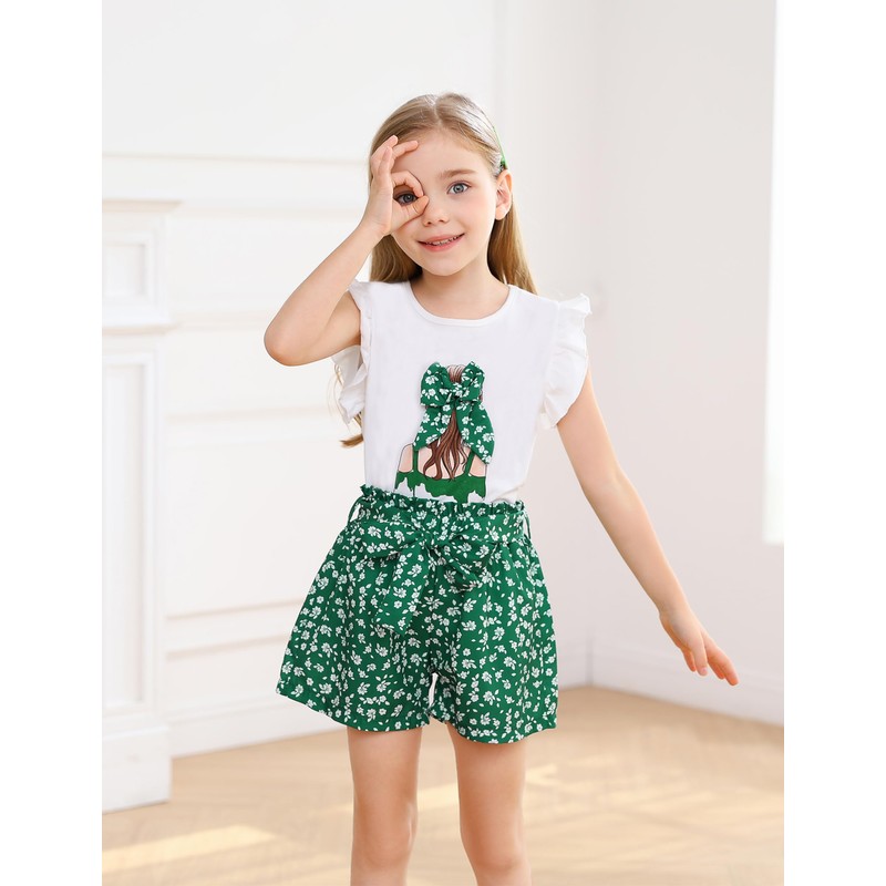 EuquixZeph 5t Girls Clothes 4t Toddler Girl Outfit Set Sleeveless Print Graphic Bow T Shirts and Print Shorts Sets Waist Belted Green Ditsy Floral Shorts For Spring Summer