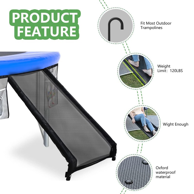 - COMPREHENSIVE SAFETY GUARANTEE:The large hook design on the top makes the connection between the slide and the trampoline stronger and safer.Our trampoline slide attachment will create safe, protective access up/down the trampoline for smaller kids and prevent bumps and bruises.(Socks are not recommended unless they are trampoline socks)