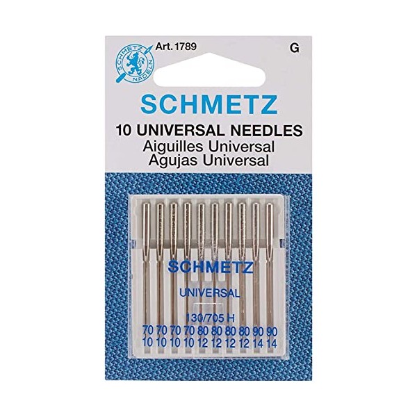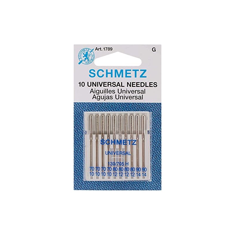 Experience smooth sewing with the schmetz universal sewing machine needles. The general-purpose needles in this carded pack feature a slightly rounded point allowing use on woven fabrics and Knits. This set of universal sewing needles contains 10 needles in assorted sizes. These schmetz universal needles are compatible with household sewing machine brands. size assortment: 4 needles - 70/10 4 needles - 80/12 2 needles - 90/14.