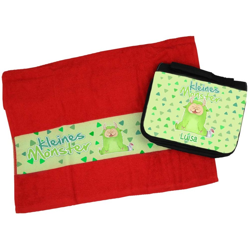 Handtuch und Kulturbeuel im Set und Motiv mit kleinem grünen Monster für Jungen und Mädchen. Perfekt geeignet für Kindergarten, Schule und Freizeit.