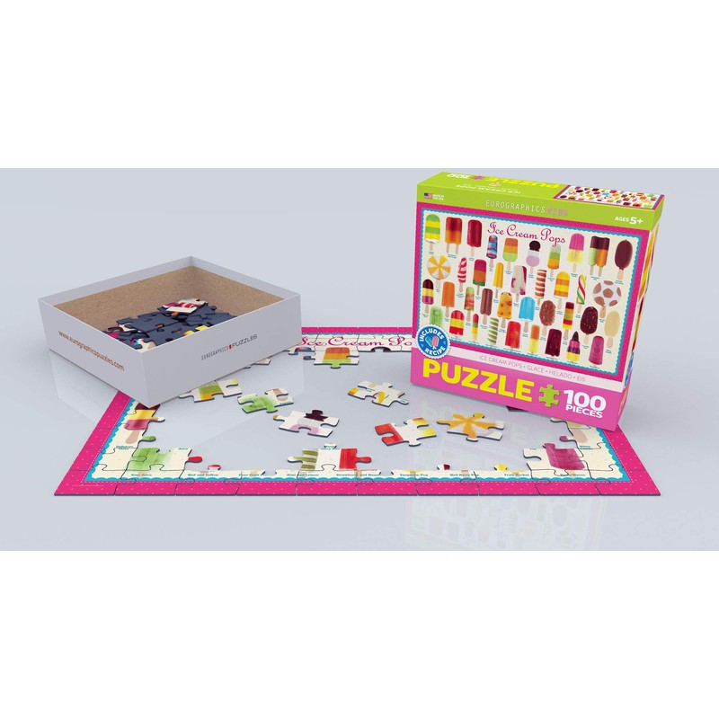 EuroGraphics Ice Cream Pops 100-Piece Puzzle. Box size: 8" x 8" Puzzle Dimensions: 10" x 13". Enjoy a mouth-watering assortment of ice cream pops without the calories. Recipe included on the back of the box. Strong high- quality puzzle pieces. Made from recycled board and printed with vegetable based ink. This superior quality puzzle will delight and educate all at the same time.