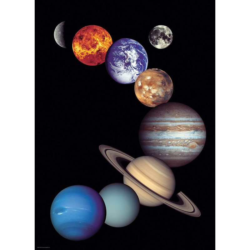 NASA Solar System. 1000 piece puzzle. 26.5" x 19.25". The solar system is mostly empty space. The planets ¹ Mercury, Venus, Earth, Mars, Jupiter, Saturn, Uranus and Neptune are quite limited in size compared to the space between them. This superior quality puzzle will delight and educate all at the same time. Strong high-quality pieces that won't break. Easy fit puzzle pieces. Made from recycled board.