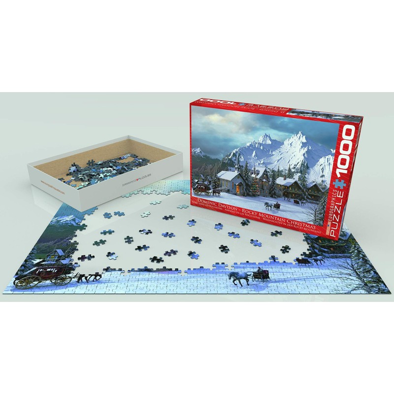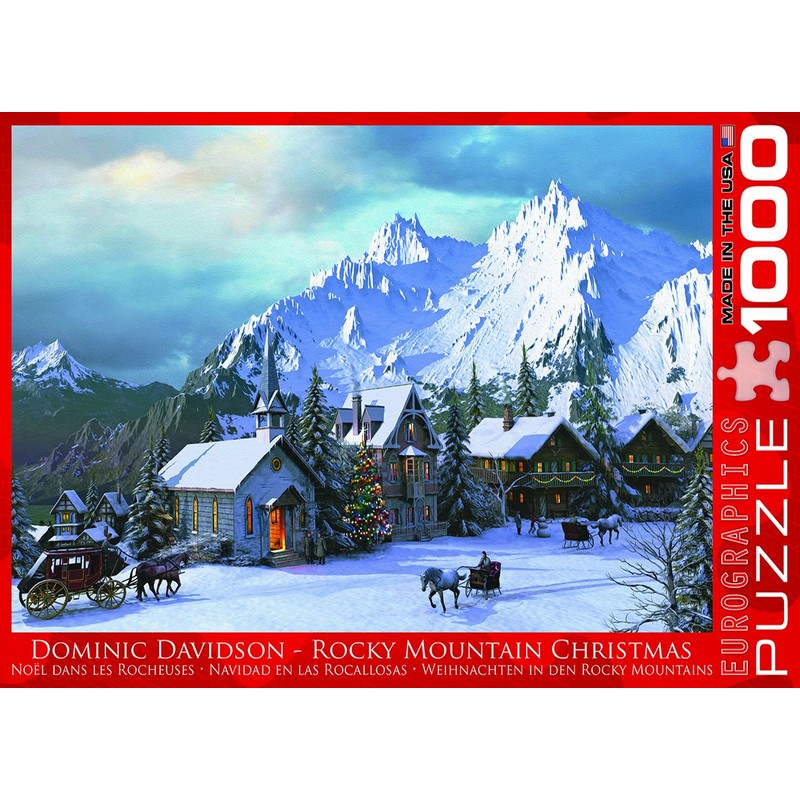 EuroGraphics Rocky Mountain Christmas 1000-Piece Puzzle. Box size: 10" x 14" Puzzle Dimensions: 19.25" x 26.5". Rocky Mountain Christmas inspires the soothing wintry scene of a snowy Christmas. This beautiful winter scene provides a fun way to celebrate the holidays with family. Dominic Davidson is a freelance digital artist renowned for creating scenes that are beautiful, calming, and rich in detail featuring cottages, rural landscapes and cities. Strong high-quality puzzle pieces. Made from recycled board and printed with vegetable based ink. This superior quality puzzle will delight and educate all at the same time.