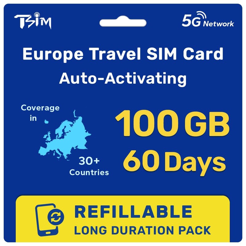Europe SIM Card for Travel 60 Day 100GB for 36 Countries | Refillable Long Duration Pack | High Coverage Multi-Operator 5G Network | Auto-Activating | Hotspot Allowed