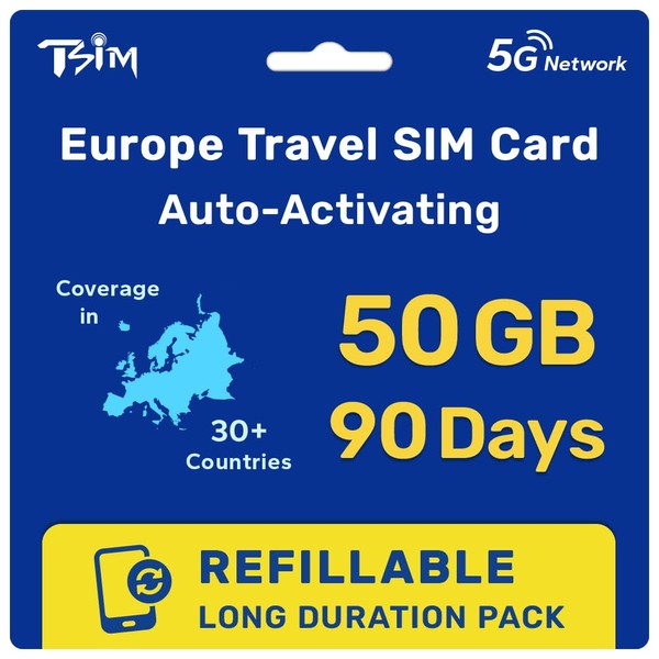 Europe SIM Card for Travel 90 Day 50GB for 36 Countries | Refillable Long Duration Pack | High Coverage Multi-Operator 5G Network | Auto-Activating | Hotspot Allowed