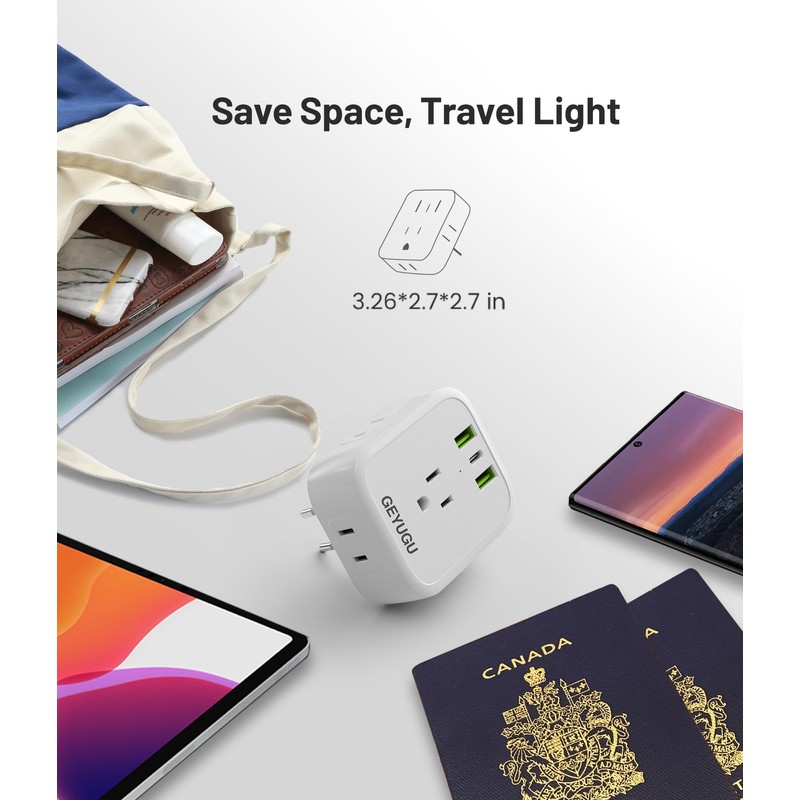- 7 in 1 Travel Plug Adapter: The travel plug adapter has 4 outlets, 2 USB-A charging ports (QC 18W), and 1 USB-C charging port (PD 20W). It can handle a maximum capacity of up to 4000 Watts (Max 250 Volt, 16 A), enabling simultaneous charging of 7 devices. The 4-sided sockets are separated without obstructing each other, saving desktop space. Ideal for laptop, cell phone, Tablet, etc.
