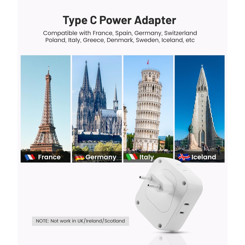 - Faster Charging Speed: Our European travel plug adapter with USB-C PD technology offers a PD 20W fast charging port. This allows for twice the charging speed compared to other adapters, providing a quicker charge for your devices.