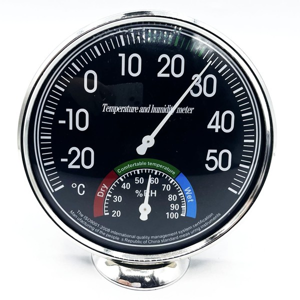 - Main features: analogue hygrometer and thermometer with ABS housing. Includes footboard and hanging loop. Diameter: 13 cm.