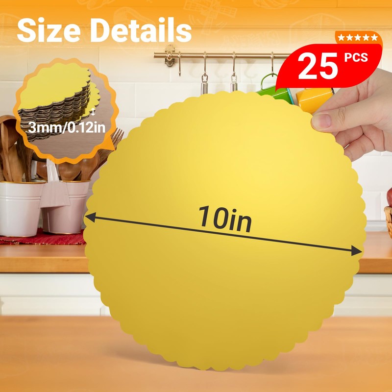 - Package Included You will receive 25 pieces of gold cake boards, each with a diameter of approximately 10 inches. They are good for displaying most standard-sized cakes and making them look more elegant and sophisticated.