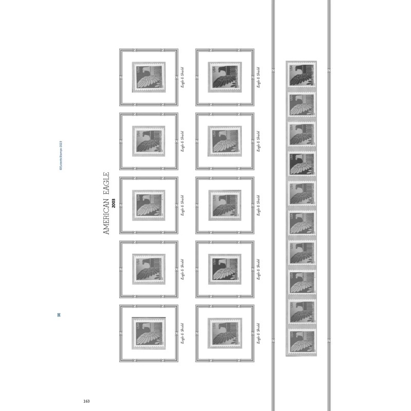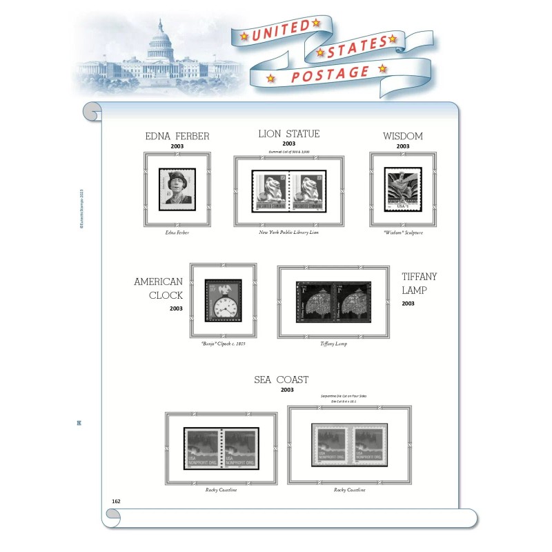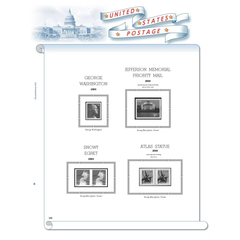 My 2003 U.S. Regular Issue Singles COMPLETE Supplement contains 4 pages. These 8.5 x 11 inch album pages are printed single sided on 60 lb., acid-free, white paper with rounded corners, and 3 hole punched. The page design features a distinct blue Capital Building illustration at the top of the page. An attractive addition to your White Ace album.