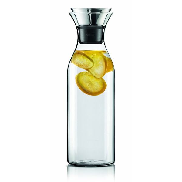 - Fridge carafe: perfect for water, juice and iced tea that can be brewed directly in the carafe with the tea filter of an Eva Solo tea maker. Fits most refrigerator doors. With or without neoprene sleeve to keep contents colder for longer. Patented lip for drip-free pouring. 1 litre, borosilicate glass, silicone and stainless steel.