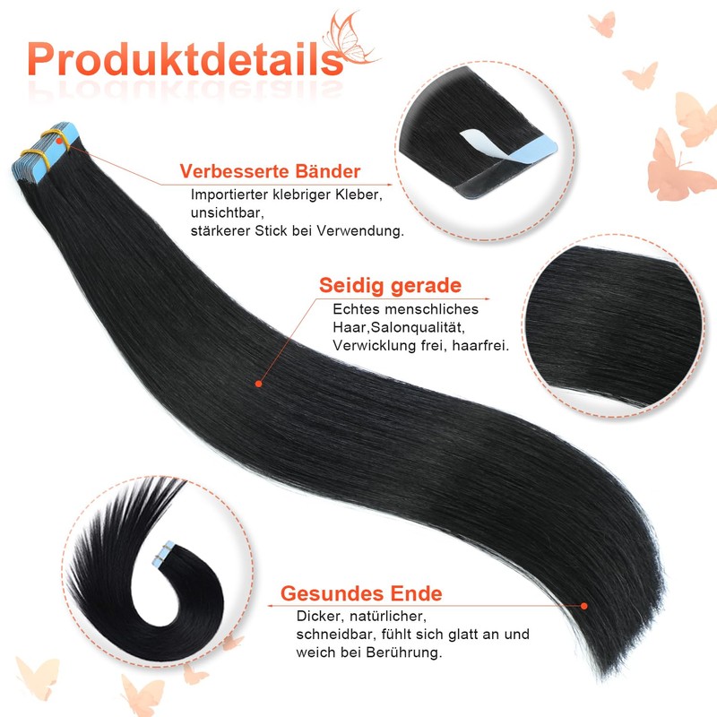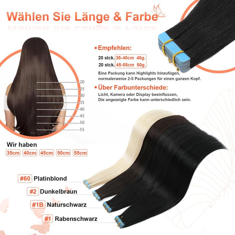 - Lengths and colours: Each pack of tape-in hair extensions made of human hair has 20 strips with a total weight of 40-50 g, so you do not feel heavy or slip. Lengths: 14", 16", 18", 20", Colors: #1, #1B, #2, #60. We recommend 2-5 packs if you want fuller hair. They can be used for 5-8 weeks.