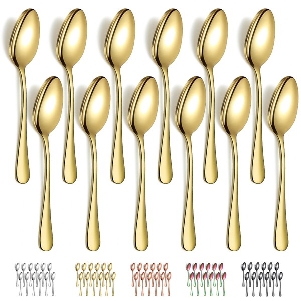 Evanda Gold Dinner Spoons 12 Pieces, Gold Titanium Plating Stainless Steel 18.5cm Spoons, Dessert Spoons, Table Spoon, Soup Spoons, Easy to Clean, Dishwasher Safe