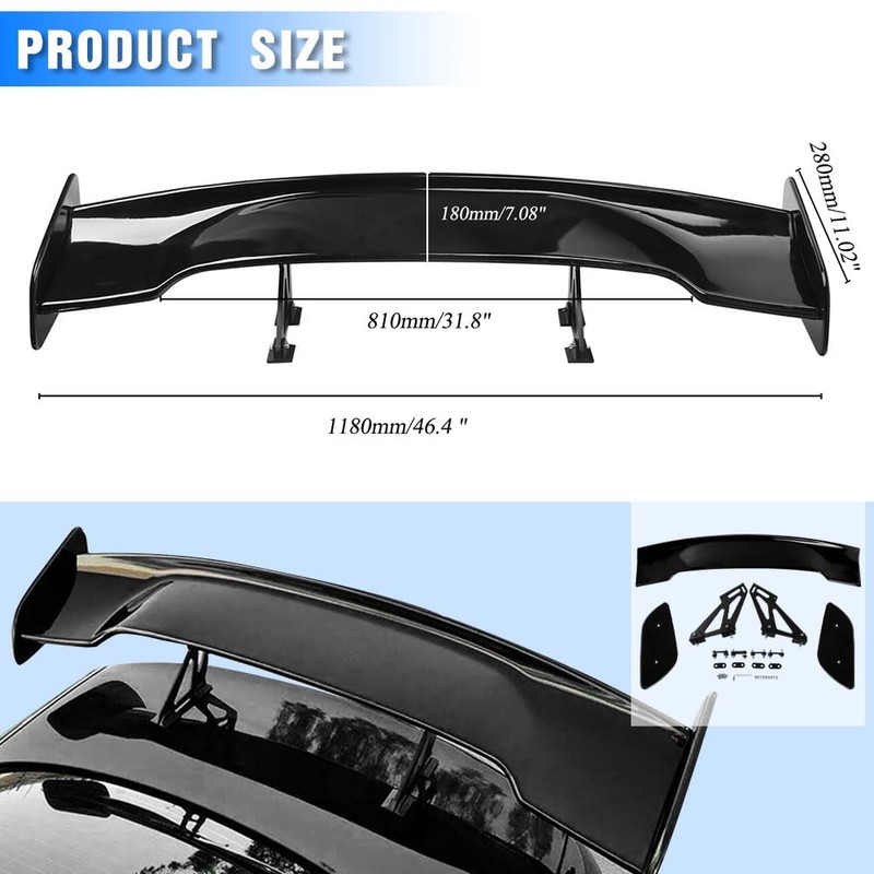 - UNIVERSAL APPLICATION: This universal size spoiler fits most vehicles. Rear spoiler wing length (maximum distance): 46.4 inches. Please measure the size of the trunk lid before purchase to make sure the product can better decorate your car