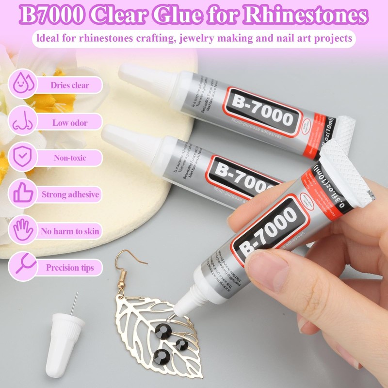 - Glue of Diamond JewelryThe professional rhinestone glue is designed with a tiny needle for easy operation and precise control. B glue clear with precision tip can be opened after use, and won't get gagging. Full transparency jewelry glue dries clear with clean and gloss finish, wont yellow over time, strong and waterproof. Works on most surfaces of jewelry, metal, plastic, glass, rubber, ceramics, wood, cloth, leather, and more