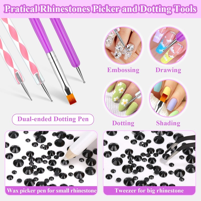 - Helpful Pickup & Dotting ToolsThe rhinestones and glue kit comes with helpful tools for better bonding, tweezer and picker pen can pick up large& small rhinestones, the dotting tool helps to control the glue and also can use on nail art painting