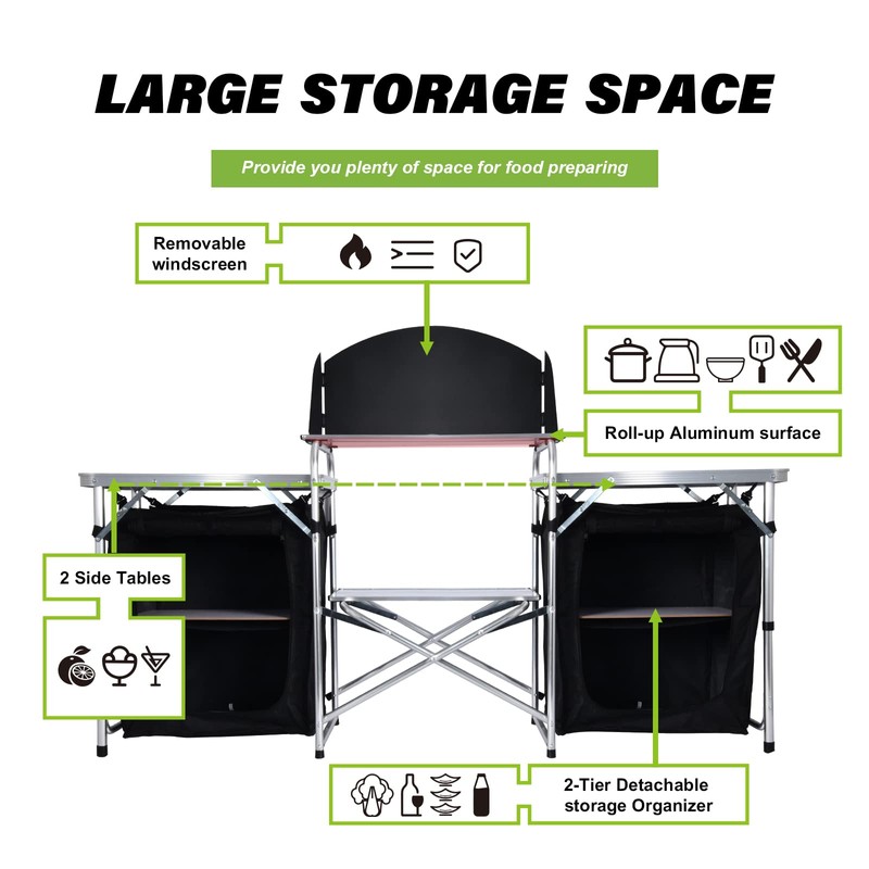 Evcitn Camping Kitchen Table with Pcinic Mat, Aluminum Portable Folding Camp Cook Table with Windshield, Storage Organizer, Quick Installation for Outdoor Picnic Beach Party Cooking, Black