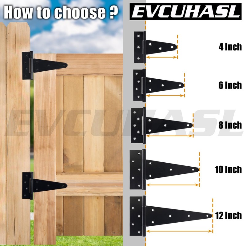 - 【6 Inch Heavy Duty Hinges】 EVCUHASL's T gate hinges are made of sturdy solid iron with black powder coating glossy finish, Rugged, Corrosion Resistant, Oxidation Resistant, Anti-rust for increased hinges life and durability.