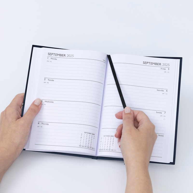2025 Diaries week to view one full week per 2 pages 2025 Diary Year Planner 2025 Year Hardback Diary Runs From 1st Jan 2025 to 31st Dec 2025 Size: A5 Ribbon Marker Double page year planner International Dialling Codes World Time Zones World Currencies Conversion Tables Metric Information Notable Dates Dates To Remember Timetables Notes Pages